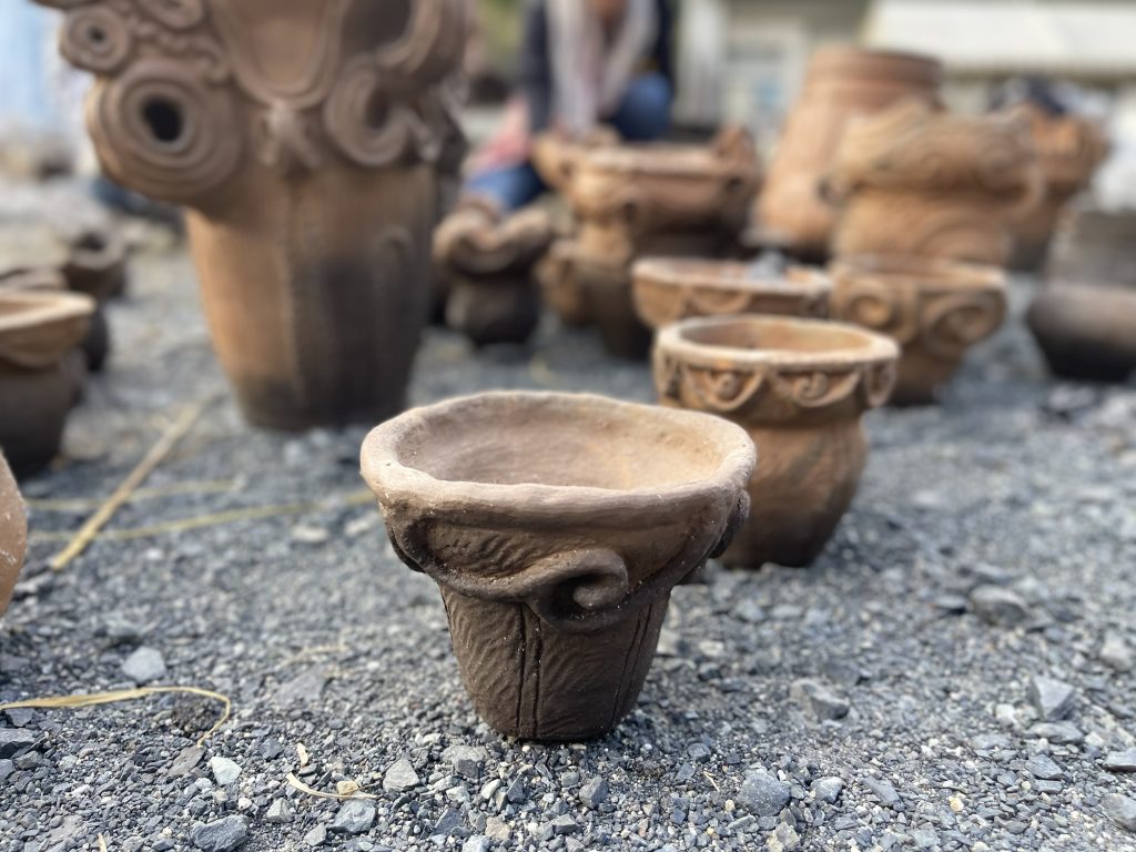 手前にあるのが初めて作った縄文土器😅小さいけど割れずに焼けました。近々、キャンプの焚火🔥で縄文人デビューします(笑)