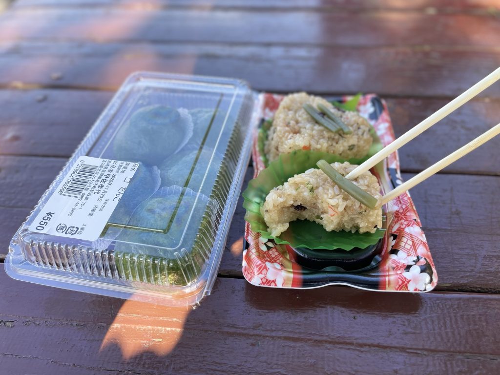 山菜おこわとよもぎ餅。素朴で優しい味だった。