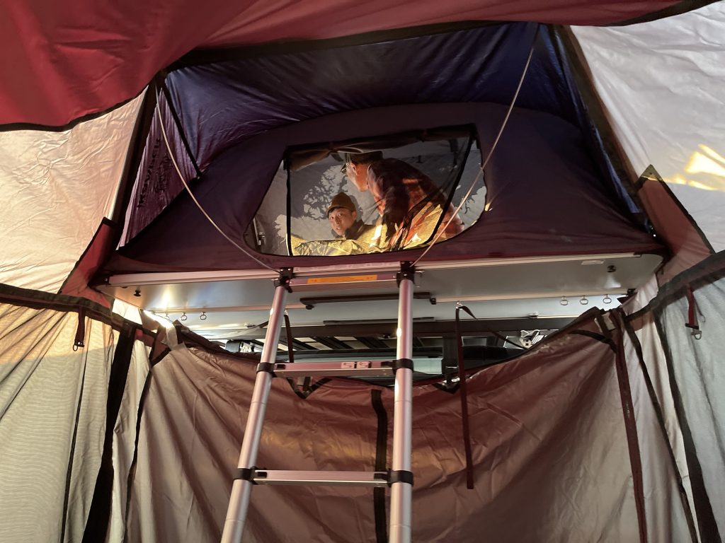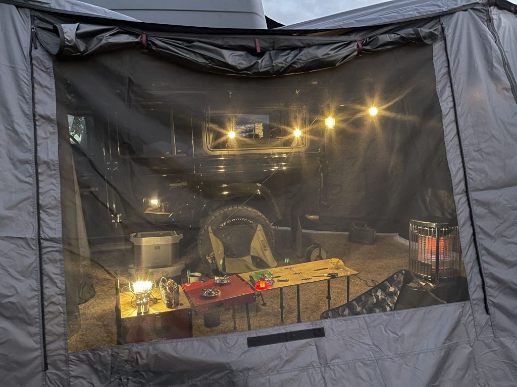 iKamperの270°オーニングを展開し、そこに照明とストーブを置く。