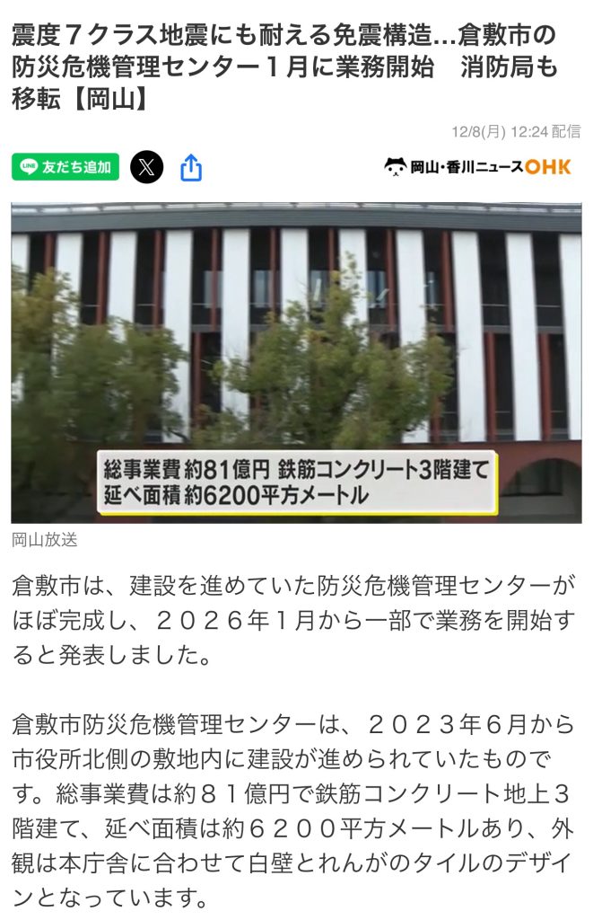 倉敷市が建設を進めてきた「防災危機管理センター」が、いよいよ2026年1月から一部業務を開始します。