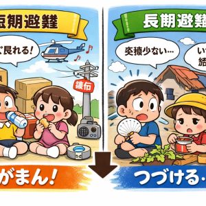 防災の考え方|短期避難と長期避難は前提がまったく違う🎒 ― これまでの防災対策は短期向けでした。長期を考えると話が変わります ― 「防災対策って何をどこまでやればいいの?」という疑問は、実は“短期避難”と“長期避難”で答えが変わります。 本記事では、短期避難生活と長期避難生活 […] 公開済み: 2026年1月12日更新: 2026年1月12日作成者: adminカテゴリー: 防災